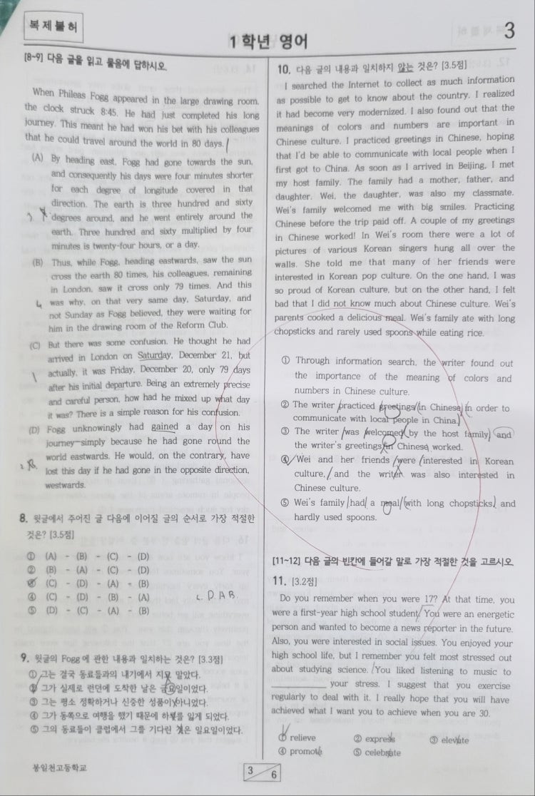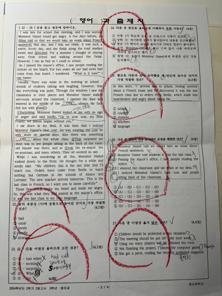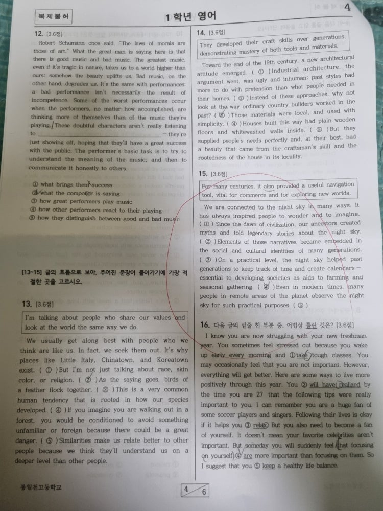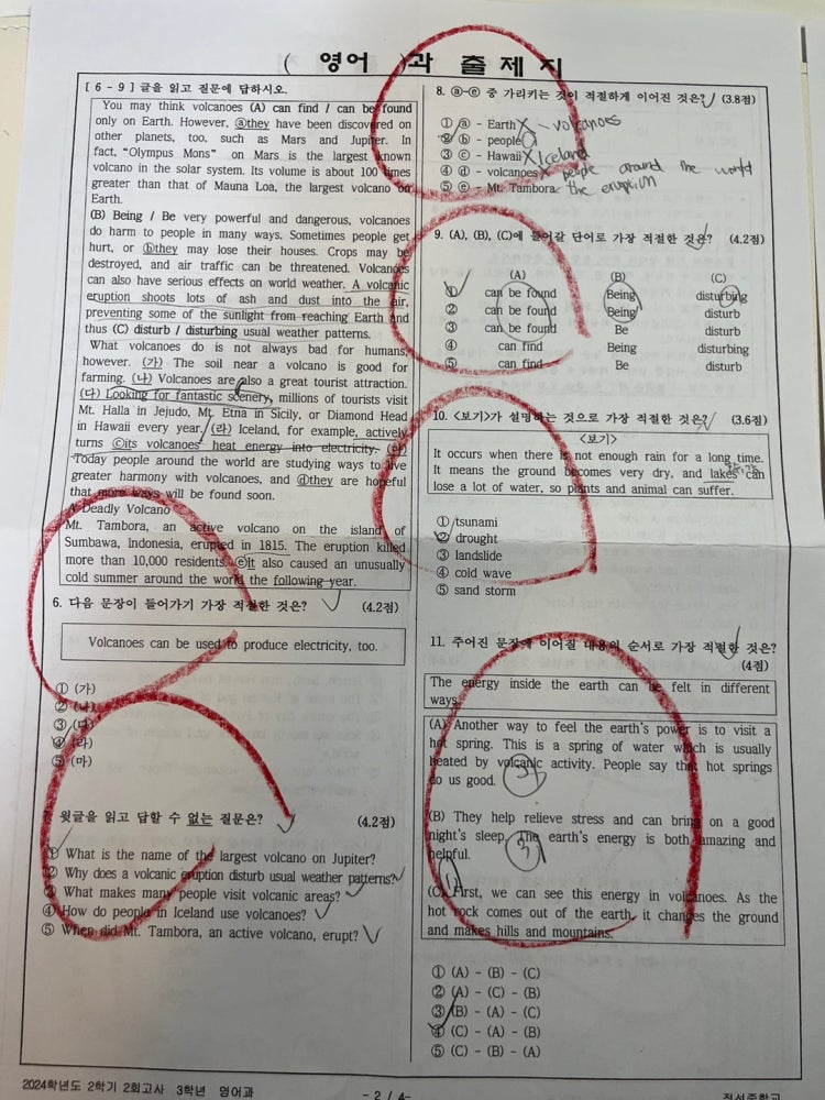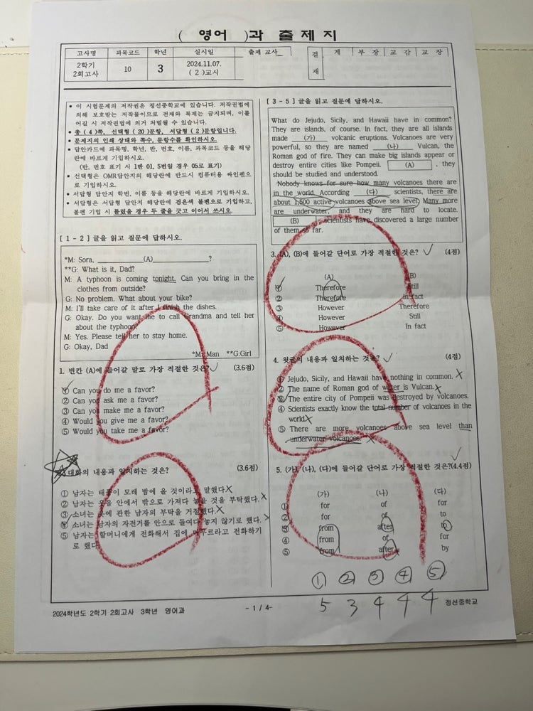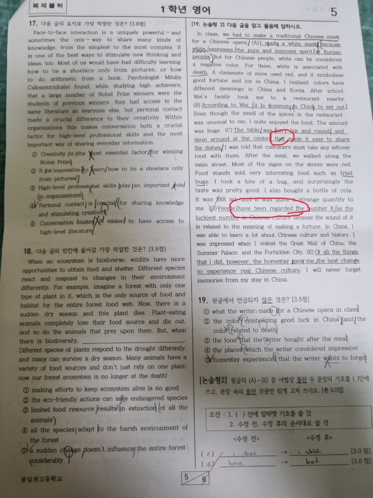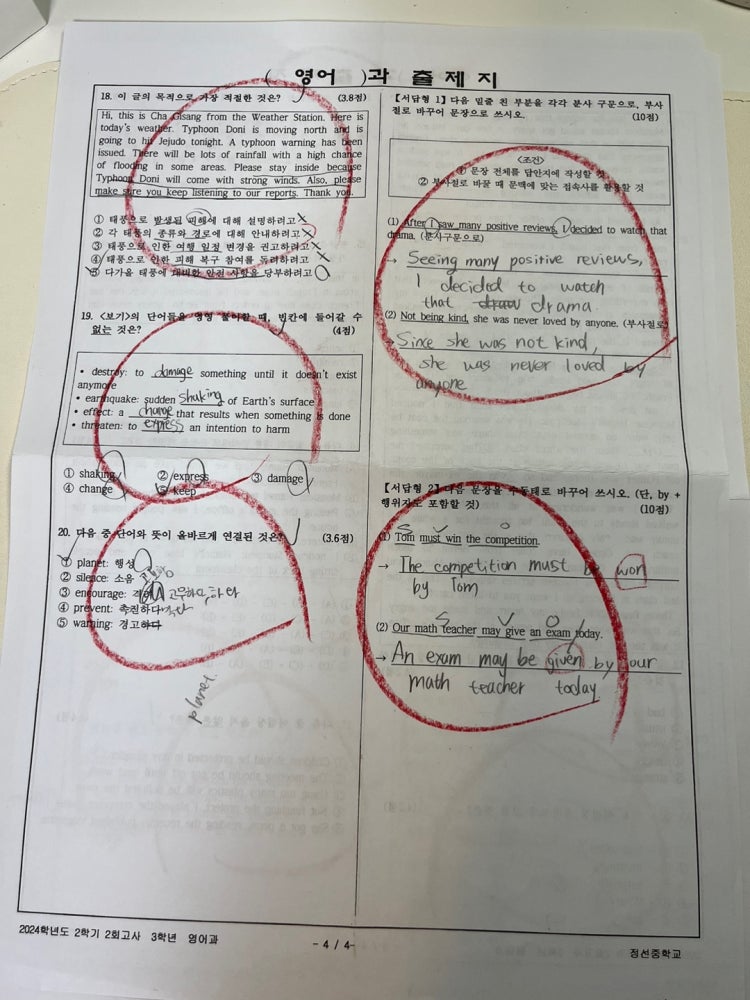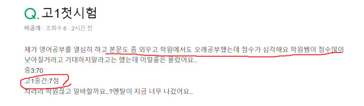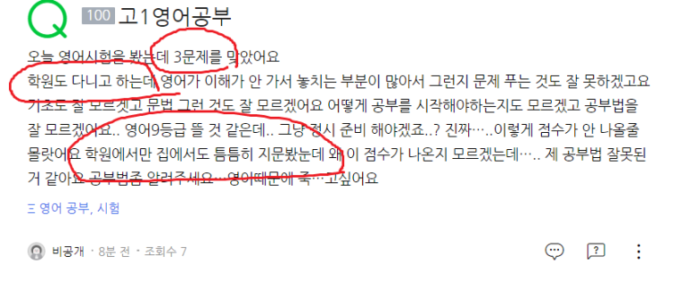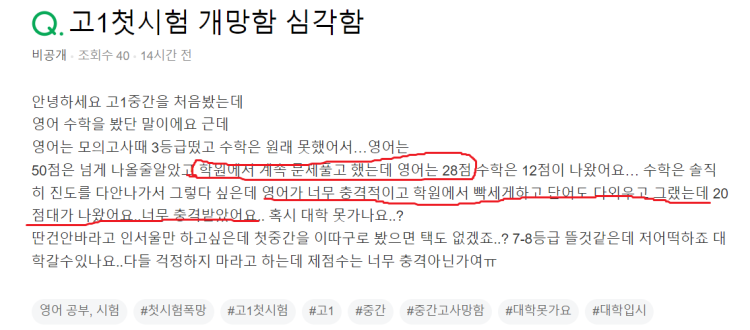 이처럼 고교 과정은 범위가 많고 변형문제와 서술형 문제와 영작 문제가 많아서 대학입시 전문가에게 체계적으로 배워야하는데, 고교 시험 경향을 모르는 중학생 전문의 지도를 받으면서 단어장이나 통문장을 암기하거나, 출제되지도 않는 문제를 양치기로 풀면 아무리 발버둥이 쳐도 다음 학생들처럼 허송세월을 보내게 됩니다. 중학교 시절 90~100점대가 고교에서 20~30점대를 맞기도 합니다. 소위 말해서 폭망합니다. 심지어 10점대를 맞기도 합니다.