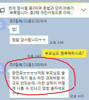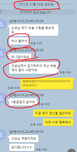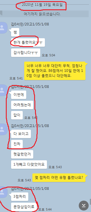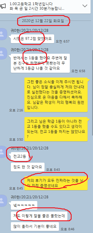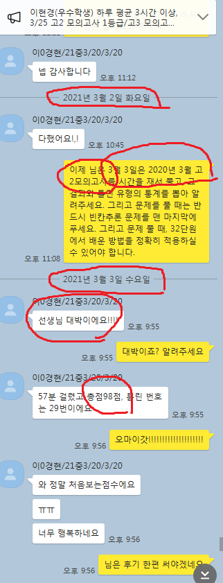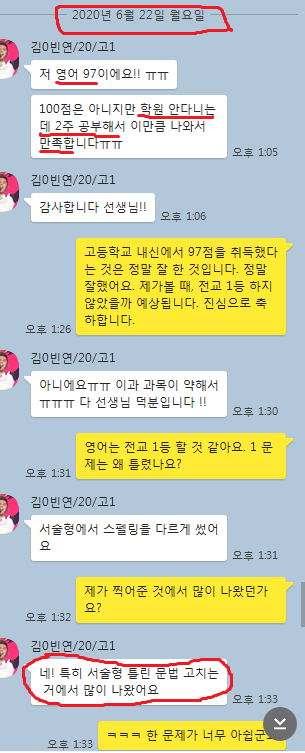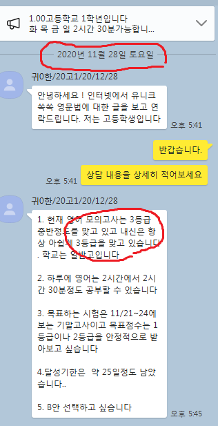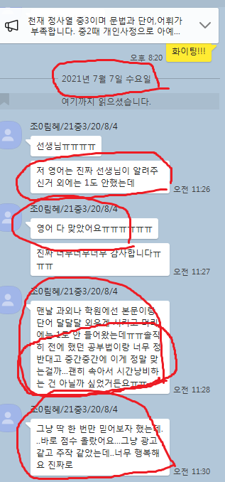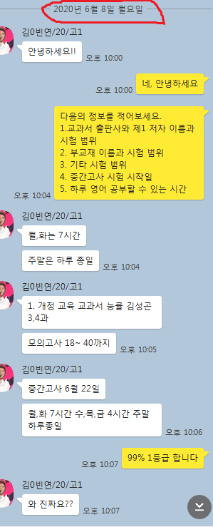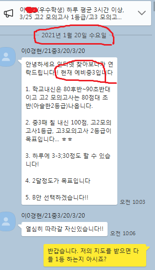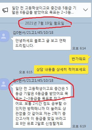 어떻게 공부하는지 카톡 공부 내용을 충분히 첨부할 테니 꼼꼼히 읽어보세요. 중.고생 후기는 카테고리 1번의 (8/9)번에 모두 들어 있고 7~9등급들의 후기는 (6)번에 들어있습니다.