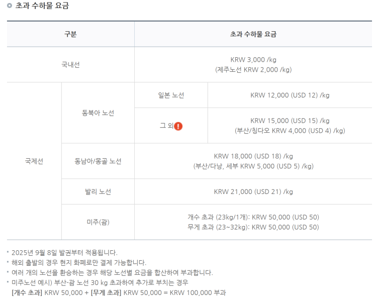 출발 전날부터는 사전 수하물 구입이 불가하므로 만일 무게가 15kg를 초과하면 카운터에서 수수료를 지불해야 합니다. 요금은 다음과 같습니다.
