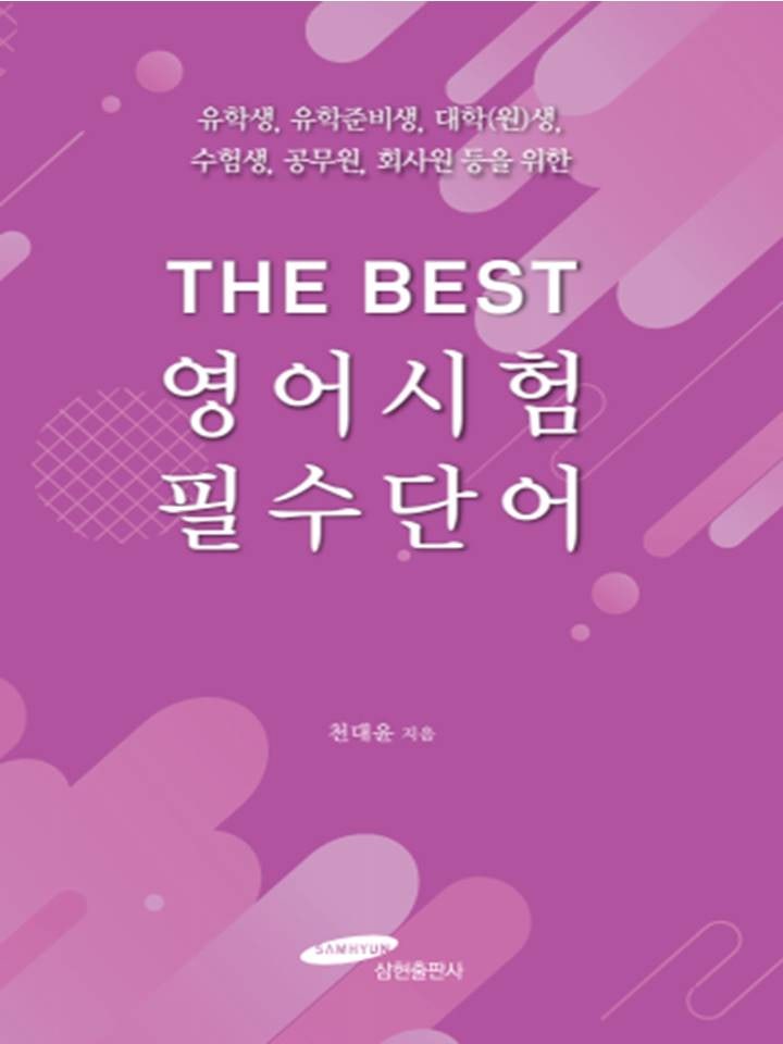 ▶영어실력 향상을 위해서, 영어, 기초부터 완성까지, 영어작문, 영어문법, 영어단어, 영어회화, 기초부터 완성까지, 천대윤 박사님의 ● The Best 영어작문 영어문법 1(천대윤 지음), ● The Best 영어작문 영어문법 2(천대윤 지음), ● The Best 영어작문 영어문법 3(천대윤 지음) 책들을 꼭 보세요. 또한, 영어 단어 어휘실력을 높이기 위해서는 천대윤 박사님의 ● The Best 영어시험 필수단어(천대윤 지음) 책을 꼭 보세요. 또한 영어회화 실력을 높이기 위해서는 천대윤 박사님의 ● The Best 영어회화 핵심문형(천대윤 지음) 책을 꼭 보세요. 영어 독해 실력을 높이기 위해서는 천대윤 박사님의 ●속독전략과 시험전략(천대윤 지음) 책을 꼭 읽어 보세요.