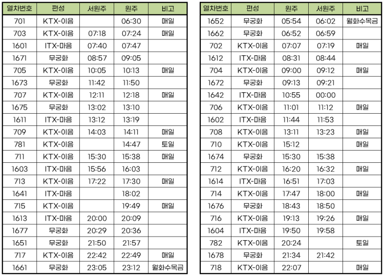 서원주역 원주역 KTX ITX 무궁화호 교대역 정차 하나요?서원주 정차 원주역 무정차 통과 반대로 원주역 정차 서원주 무정차 통과