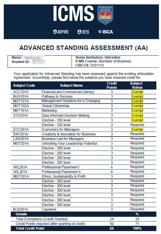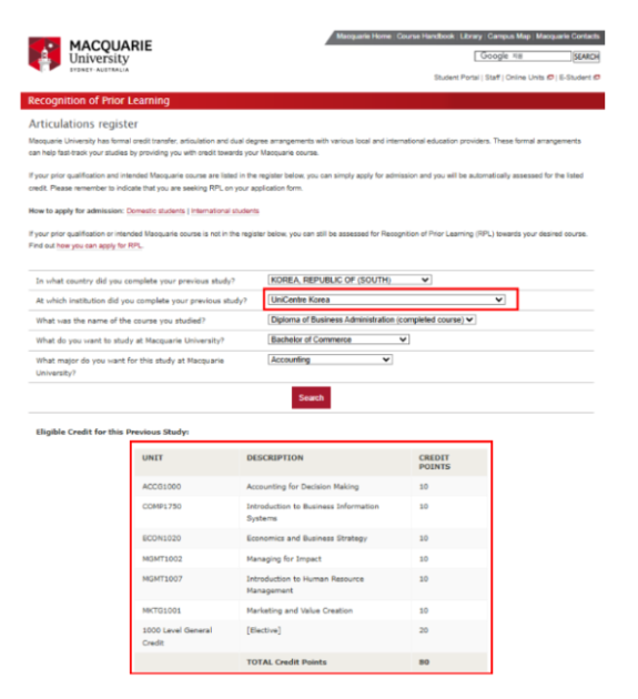 맥쿼리대학교와 유니센터의 과목 면제 협약입니다. 현지에서도 가장 난이도와 낙제율이 높은 1학년 IT 전공의 8과목을 한국에서 이수하고 학생들은 2학년으로 편입 이후에는 비교적 실무적인 과목들의 이수와 PACE 프로그램이라는 인턴십 과정들을 통해 수월하게 졸업하게 됩니다.