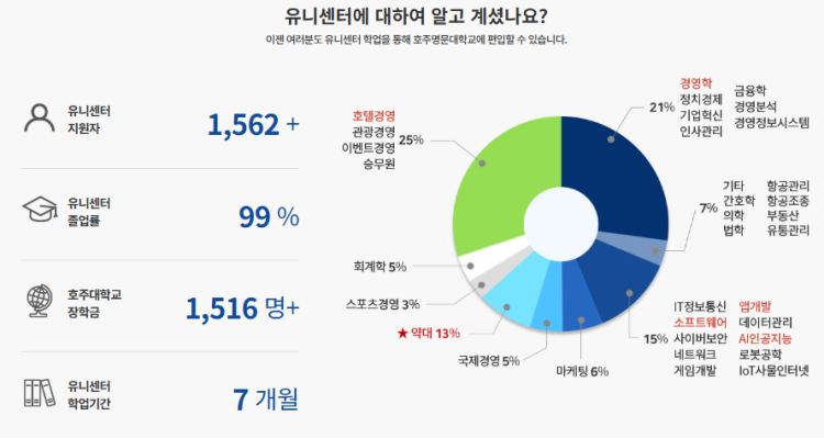 현재 유니센터 코리아에서는 26년 3월 국내 호주대학교 1학년 과정 + 27년 2월 호주대학교 편입 보장 신입생을 모집중에 있습니다.경영, IT, 약대 계열로 진행되는 유니센터 국제전형 프로그램은 전국의 예비 호주유학생들의 문의로 빠르게 정원이 차오르고 있으니 호주대학편입을 목표로 하신다면 입학 지원을 통해 정원을 확보하고 결정하시는 것을 추천드립니다.