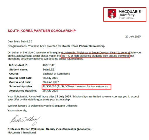 맥쿼리대학교는 유니센터 국제전형 프로그램을 통해 진학하는 모든 학생들에게 한화 기준 1,800만원의 장학금을 조건없이 지금해드리고 있으며 조건과 유니센터, 맥쿼리대학교의 선정에 따라 최대 2,800만원의 장학금을 적용해드리고 매 학기 학생들은 해당 장학금을 수여받으며 학업을 진행하고 있습니다.