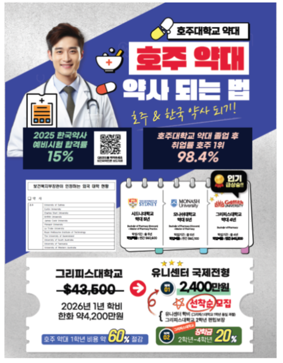 현재 26학년도 수능 결과 발표로 인해 많은 학생들의 지원 접수가 몰리고 있으며 약대편입전형의 경우 특히 정원이 빠르게 차오르고 있습니다. 최종 입학 결정까지의 모든 절차는 무료로 진행되며 호주약대편입을 고려하는 분들께서는 사전 무료 편입학허가서 발급을 통해 정원을 확보해두시기를 추천드립니다.
