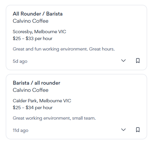 호주 내 전 지역에서 사용되는 구인구직 관련 플랫폼인 Seek.com에서 발췌한 이미지입니다. 유학생들이 가장 보편적으로 요구 조건 없이 구할 수 있는 카페 파트타임입니다. 시급은 $25-$34로 최저시급을 웃돌고 있는 것을 볼 수 있습니다.