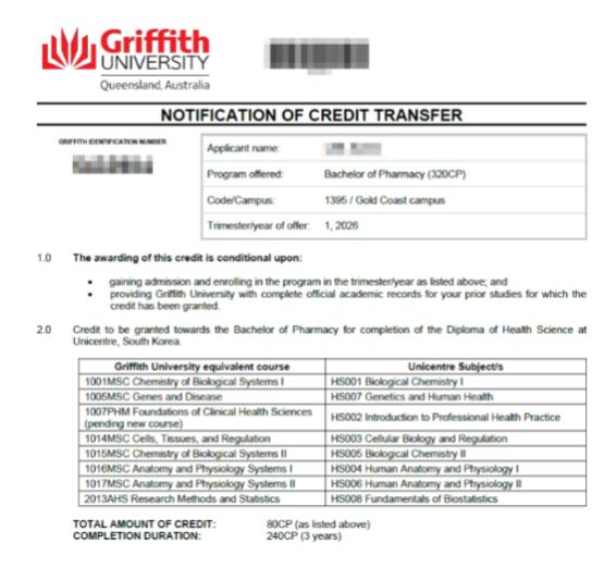 또한 전 세계를 강타한 코로나 팬대믹 사태 이후 모든 국가들에서는 의료계열 종사자의 필요성이 강조되고 있습니다. 유니센터 약대전형을 통해 명문 호주약대 그리피스대학교 2학년으로의 편입이 가능하며 이때에 졸업까지 한화 약 2,200만원의 장학금을 보장받게 됩니다.